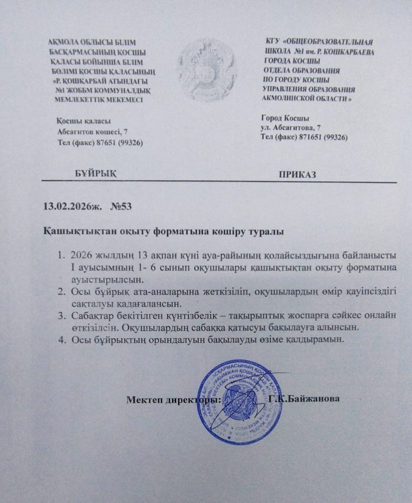 КГУ "Общеобразовательная школа №1 имени Рахымжана Кошкарбаева города Косшы отдела образования по городу Косшы управления образования Акмолинской области"