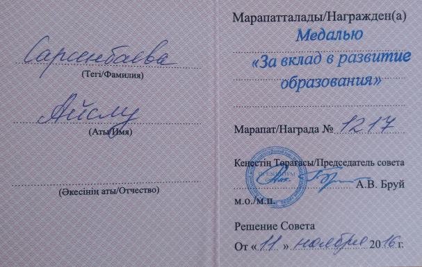 Сарсенбаева Айсұлу Биғожақызы Ақмола облысы Целиноград ауданы Р. Қошқарбаев атындағы №1